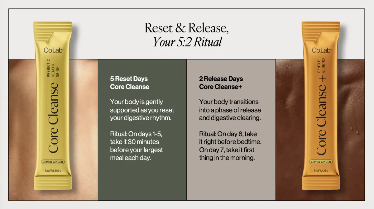 Core Cleanse uses a UNIQUE 5/2 Ritual to help you optimize the health of you Digestive System. Typical teas just clear the GI system daily but thats not healthy because you also are clearing out the GOOD as well as the BAD. With Core Cleanse we use a Release and Restore system to pack in all the good after you have had a release.